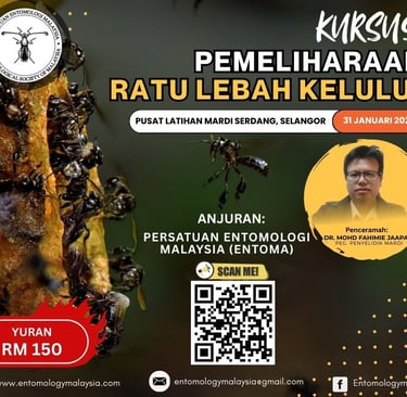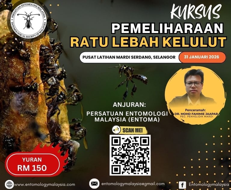 ENTOMA dengan sukacitanya menjemput tuan/puan menyertai Kursus Penternakan Ratu Lebah Kelulut, sebuah kursus teori dan amali yang memberi perspektif baharu dalam kaedah penggandaan koloni melalui ratu secara lebih mudah, sistematik dan berkesan.